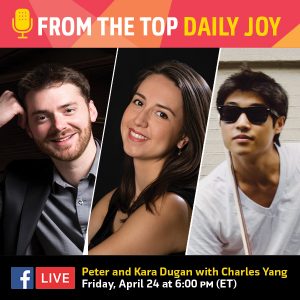 Friday, April 24 at 6 PM ET – Facebook Live Concert with From the Top Host Peter Dugan and his wife Kara (mezzo soprano), and special guest violinist Charles Yang – from New York, NY.