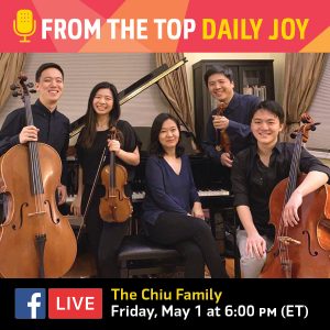 Friday, May 1 at 6 PM ET – Facebook Live Concert with the Chiu Family of Palatine, IL, featuring Cameron Chiu, 18-year-old cellist who is part of From the Top’s new “Blanket Fort Show” and creator of the popular “The Swan” video, along with his parents Chicago Symphony Orchestra violinist Cornelius Chiu, Music Institute of Chicago faculty/pianist Inah Chiu, and sister Karisa (violin) and brother Krystian (cello). Join us at Facebook.com/FromtheTopFans/Live.