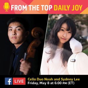 Friday, May 8 at 6 PM ET – Facebook Live Concert with cello duo Noah and Sydney Lee of Oakland, New Jersey. Noah was featured on From the Top’s Tiny Desk concert in 2018. Join us at Facebook.com/FromtheTopFans/Live.