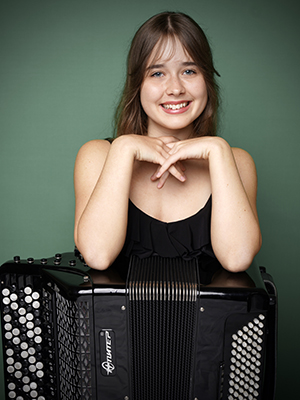 In November 2021, Maria was awarded the title “Prodigy of the Year” and was selected to grace the cover of the “Accordion Stars Illustrated” Magazine, December/January Issue. Often collaborating with her father and teacher, Sergei Teleshev, the two have established a duo by the name of “TWO ACCORDIONS.” It is one of the most successful and popular groups in this genre, touring nationally and internationally, while also providing educational school programs nationwide. In 2020, the father and daughter duo founded the popular Accordion Star International Competition that takes place every summer online, bringing together hundreds of accordion players from all over the world. In the four years since its founding, thirty-six different countries have been involved.