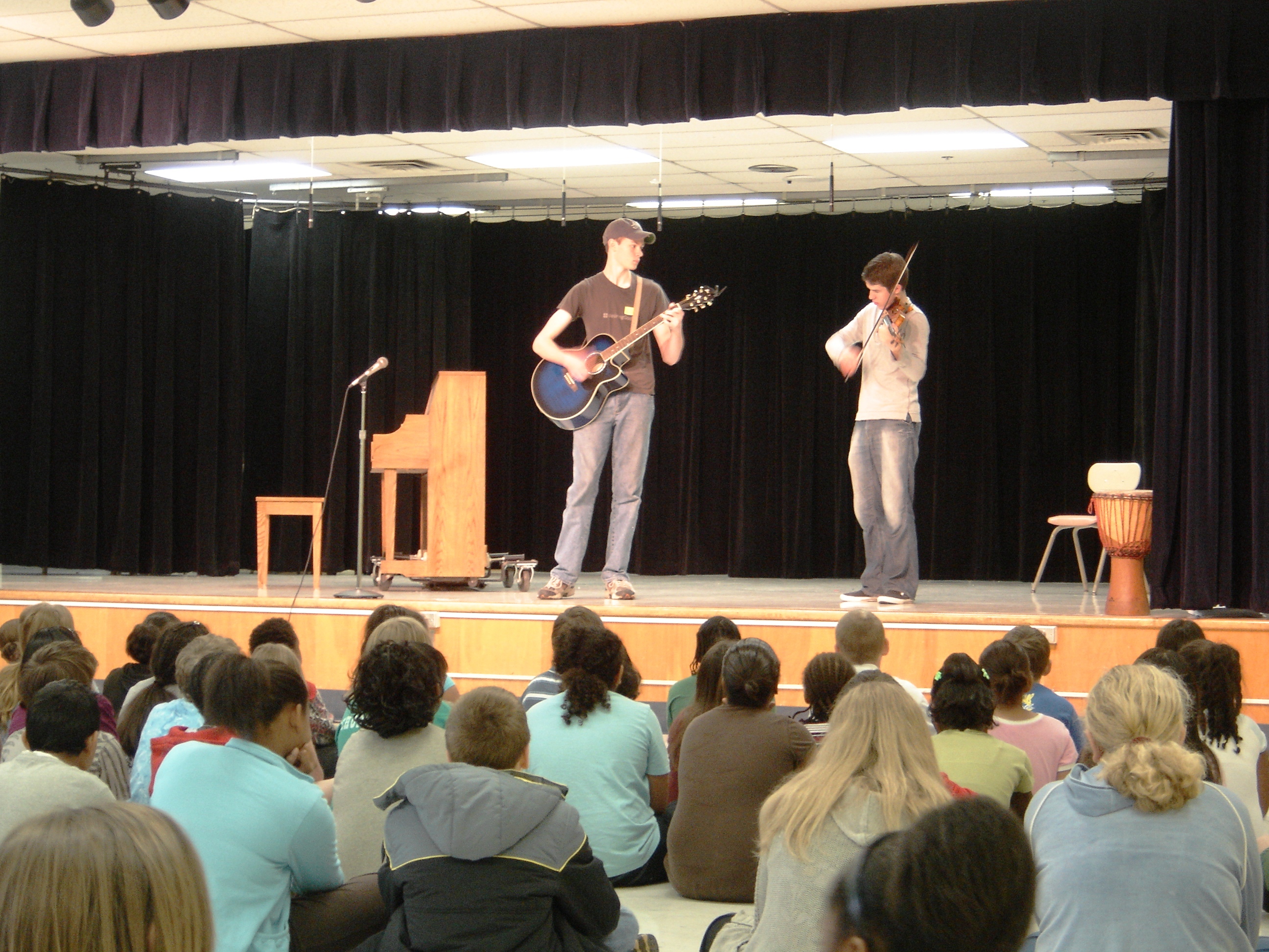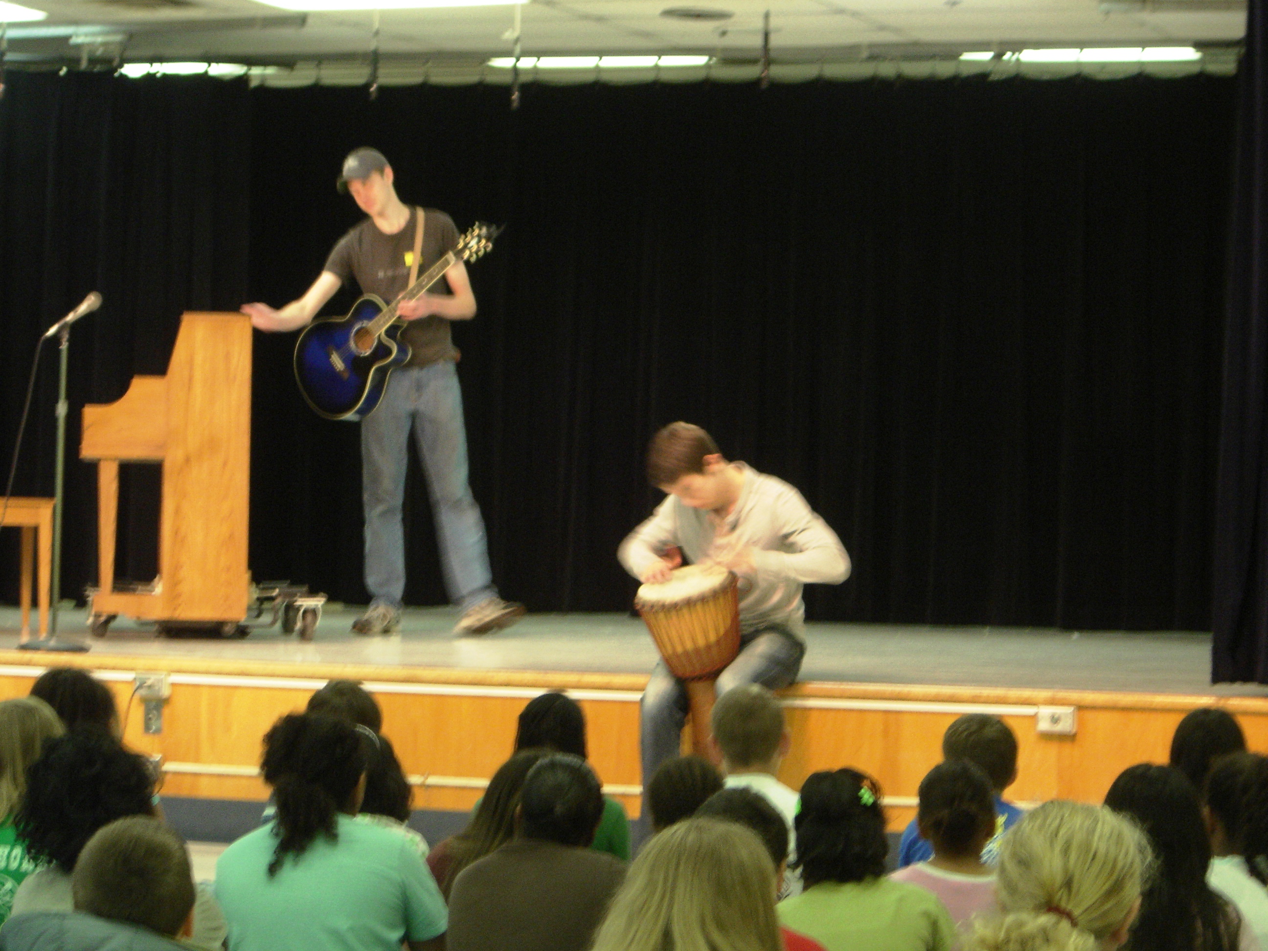 Hey Lisa!  Today I went over to Short Elementary for my cultural leadership initiative.  I knew the music director there, and he got together his fourth graders and his sixth graders to come and listen – this actually served as an inspirational performance to recruit fourth graders into his strings class.  My friend, Caleb Simmons, came along and played the guitar.  We really had some fun!  The idea was to delve into all different kinds of styles and perk up the kids’ interest.  We led off with a jazzy improvisation on violin and guitar, and I broke my E string at the end playing the violin too hard!  I then gave the kids a taste of the djembe, Caleb played a solo on guitar, and I played them some Rachmaninov on the piano!  At this point my E string had finally been replaced, so after some Pirates of the Caribbean theme music – very familiar to the kids – I gave them some classical violin, playing the catchy Bach Gavotte and Rondeau and the third movement of Lalo’s Symphonie Espagnole.  We ended with another improvisation.  All this time I was talking about the music, the composers, and the instruments, and I answered a lot of questions from the students.  They enjoyed it a whole lot, and I think I showed them just how fun/awesome/cool the violin can be!